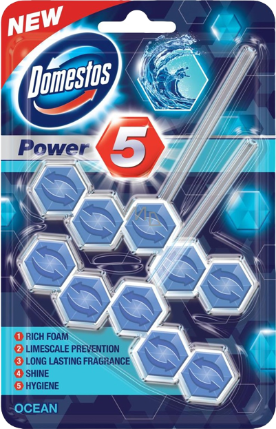 O Domestos Bloco Sanitário Power 5 Ocean deixa a sua sanita limpa e brilhante. Com uma fragrância de oceano de longa duração, espuma rica e fórmula de prevenção, garante higiene e frescura contínuas.