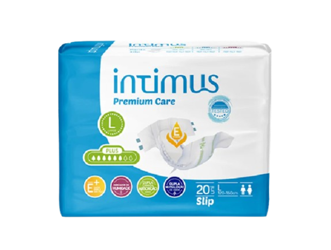 Fralda para adulto Intimus Plus, tamanho L (120×160 cm), com formato anatómico e revestimento suave e respirável. Ideal para incontinência moderada, possui adesivos laterais reposicionáveis para um ajuste perfeito e indicador de humidade.
