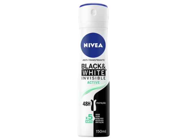 O Nivea Desodorizante Spray B&W Invisible Active Woman oferece proteção 5em1 contra odor, suor, manchas, resíduos e irritação. A sua fórmula antitranspirante sem álcool protege a roupa escura de manchas brancas e previne o aparecimento de manchas amarelas na roupa clara, cuidando da sua pele.