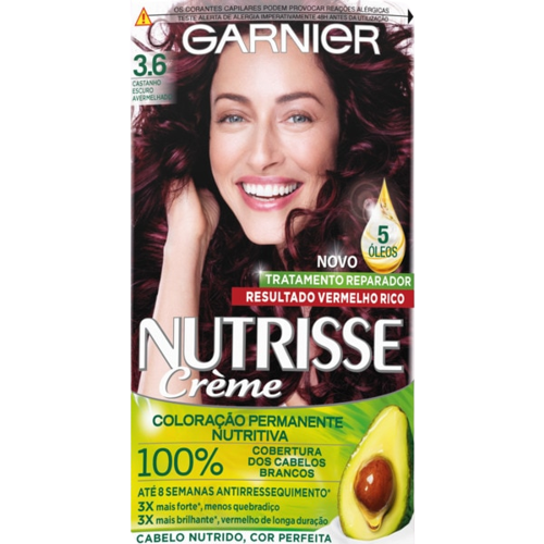 A coloração permanente Nutrisse Castanho Avermelhado 3.6 da Garnier oferece uma cor rica, intensa e duradoura, com 100% de cobertura dos cabelos brancos. Enriquecida com óleos nutritivos, deixa o cabelo profundamente nutrido e com um brilho vibrante.