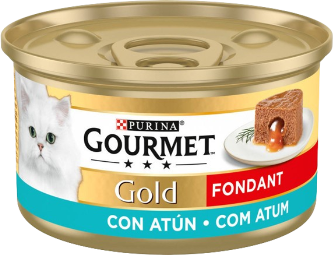 Gourmet Gold Fondant Atum: uma mousse suave e irresistível com um surpreendente recheio, para gatos adultos. Um alimento completo que fará as delícias do seu felino.