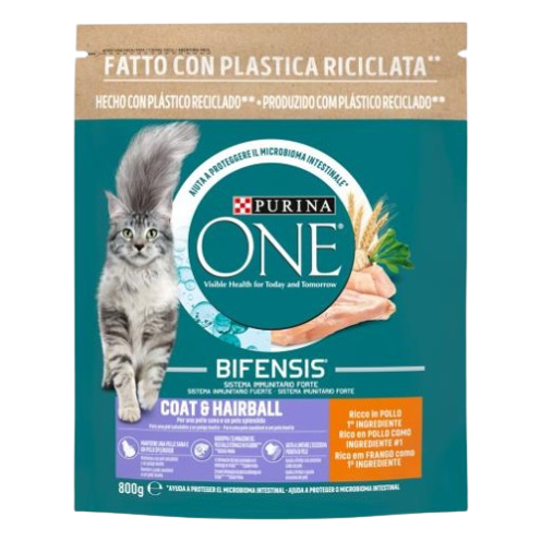 Ração Purina One Hairball com Frango, formulada com fibras para minimizar a formação de bolas de pelo e promover uma pele saudável e um pelo bonito.