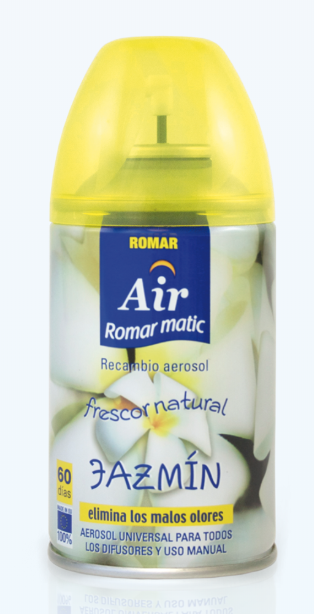 Recarga de ambientador automático Romar Matic, com fragrância a jasmim para uma frescura duradoura no seu lar. Elimina odores e perfuma o ambiente, sendo compatível com a maioria dos difusores automáticos.