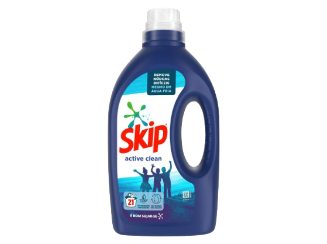 Detergente líquido Skip Active Clean para máquina de roupa, com ação Extra Power para remover as nódoas mais difíceis à primeira, eficaz mesmo em água fria e ciclos curtos.