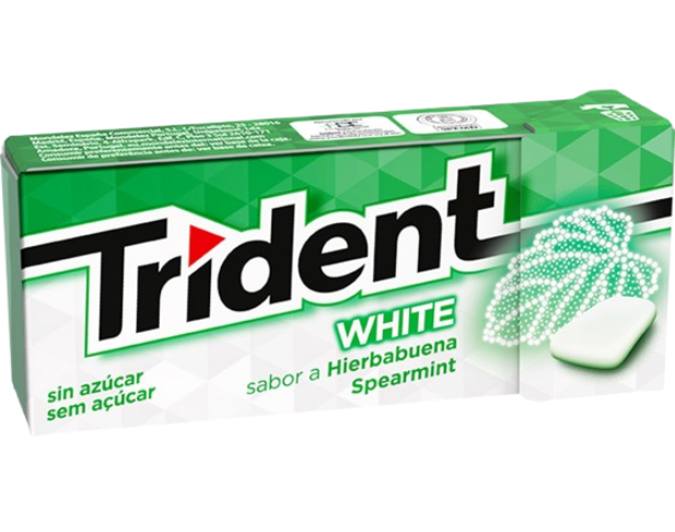 As pastilhas elásticas Trident White Spearmint oferecem um sabor refrescante a menta e ajudam a manter os seus dentes brancos. Perfeitas para levar consigo e desfrutar a qualquer momento.